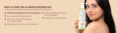 La Pink Tea & Lemon Shower Gel is perfect for those who love a refreshing, deep-cleansing bath experience while ensuring their skin remains hydrated, bright, and nourished. Infused with a unique 100% Microplastic Free Formula and plant-based ingredients such as Green Tea, Lemon, Avocado, and White Haldi, this pH-maintaining shower gel offers the perfect balance of gentle cleansing and nourishment for radiant skin every day.